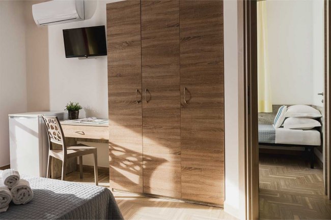 CAMERE FAMILIARE FINO A 5 PERONE: di circa 65 mq con 2 ampie camere da letto, 2 tv, aria condizionata, 1 bagno e un comodo corridoio che collega i vari ambienti, 3 balconi.