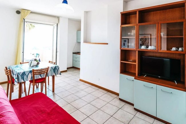 Alloggio in muratura dal piano terra al 3° piano; aria condizionata (su richiesta e a pagamento in loco); area giorno con angolo cottura e frigo con freezer; cassaforte; tv-led (32 pollici); 1a camera con letto matrimoniale; 2a camera con letti singoli o letto a castello; divano letto doppio in area giorno; bagno con doccia e bidet, asciugacapelli. Balcone arredato con tavolo e sedie. Non tutti gli alloggi sono dotati di aria condizionata. ATT.NE!!!: IN CASO DI N° 5 OCCUPANTI POTREBBE ESSERE ASSEGNATO UN ALLOGGIO TRILOCALE CON N° 5 POSTI LETTO.